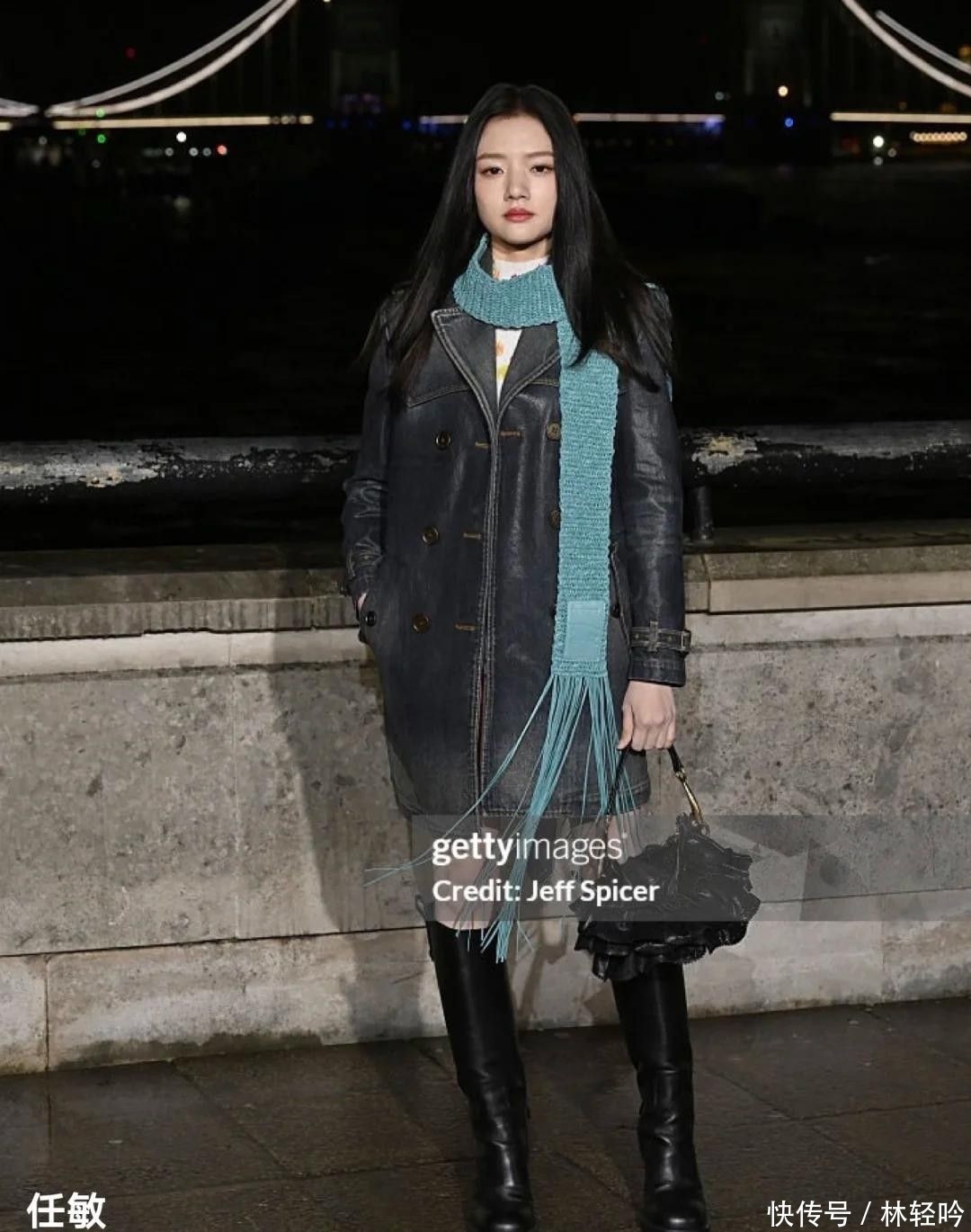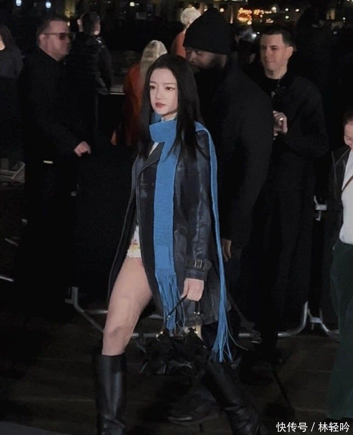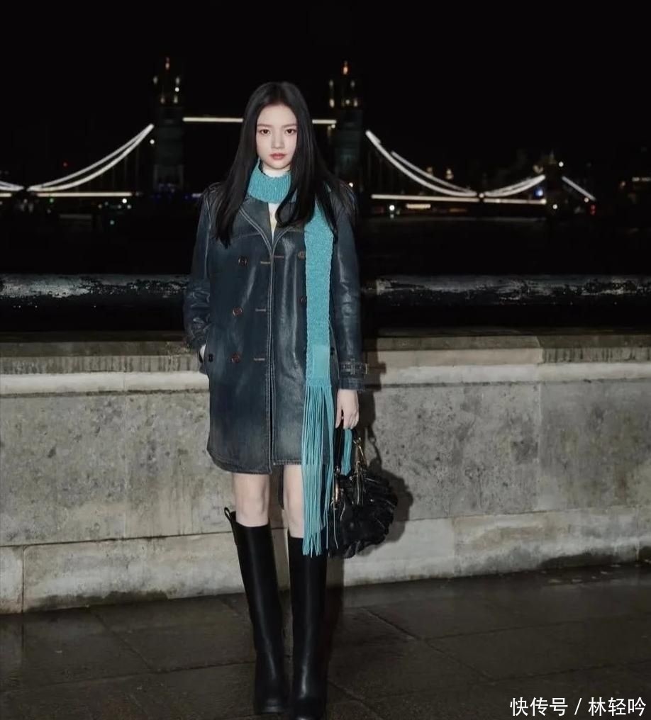 任敏的出场则迅速点燃社交平台讨论热度,她选择了一件深靛蓝收腰牛仔风衣,内搭短款针织上衣与黑色过膝长靴,整体线条干净利落,风格张弛有度。